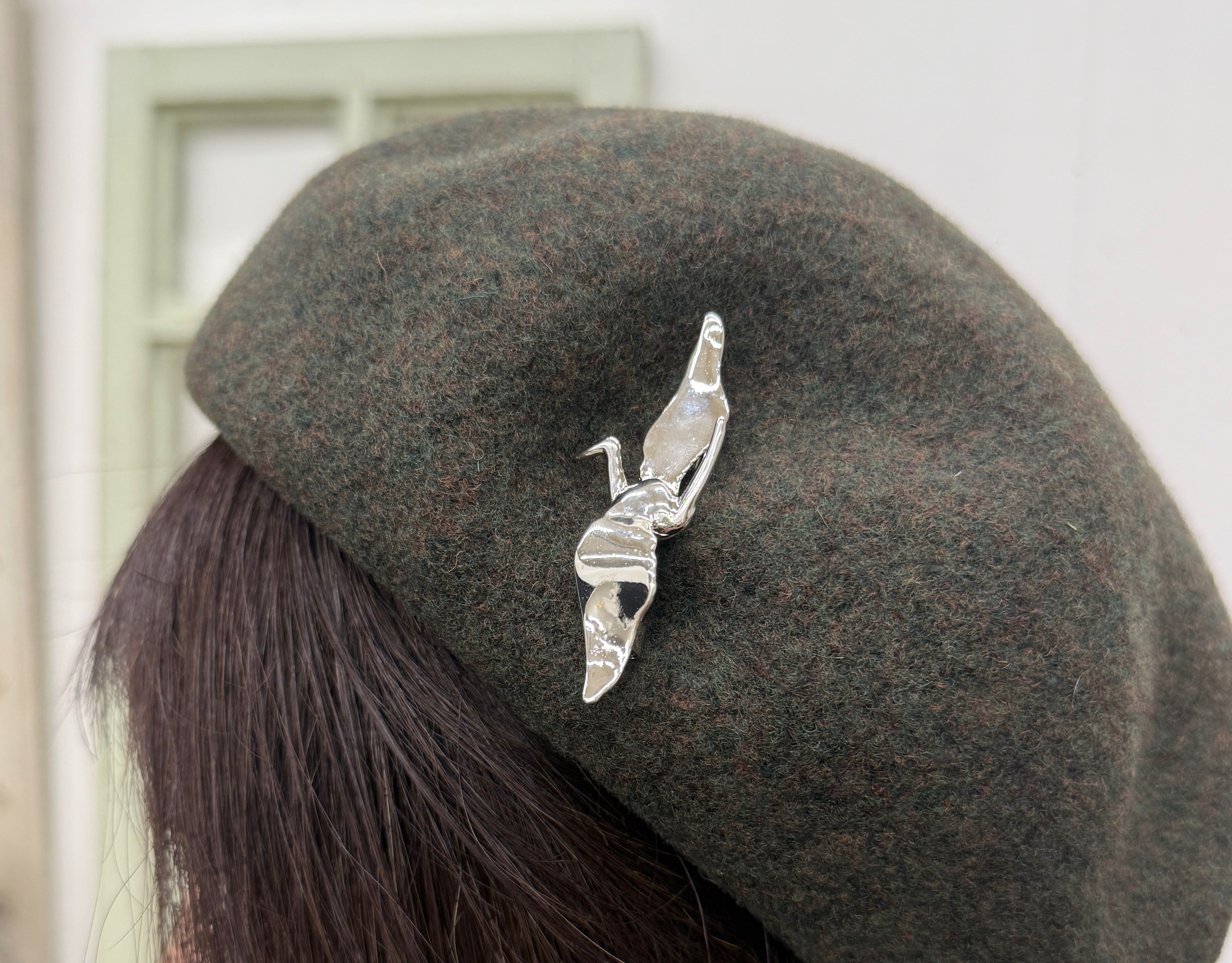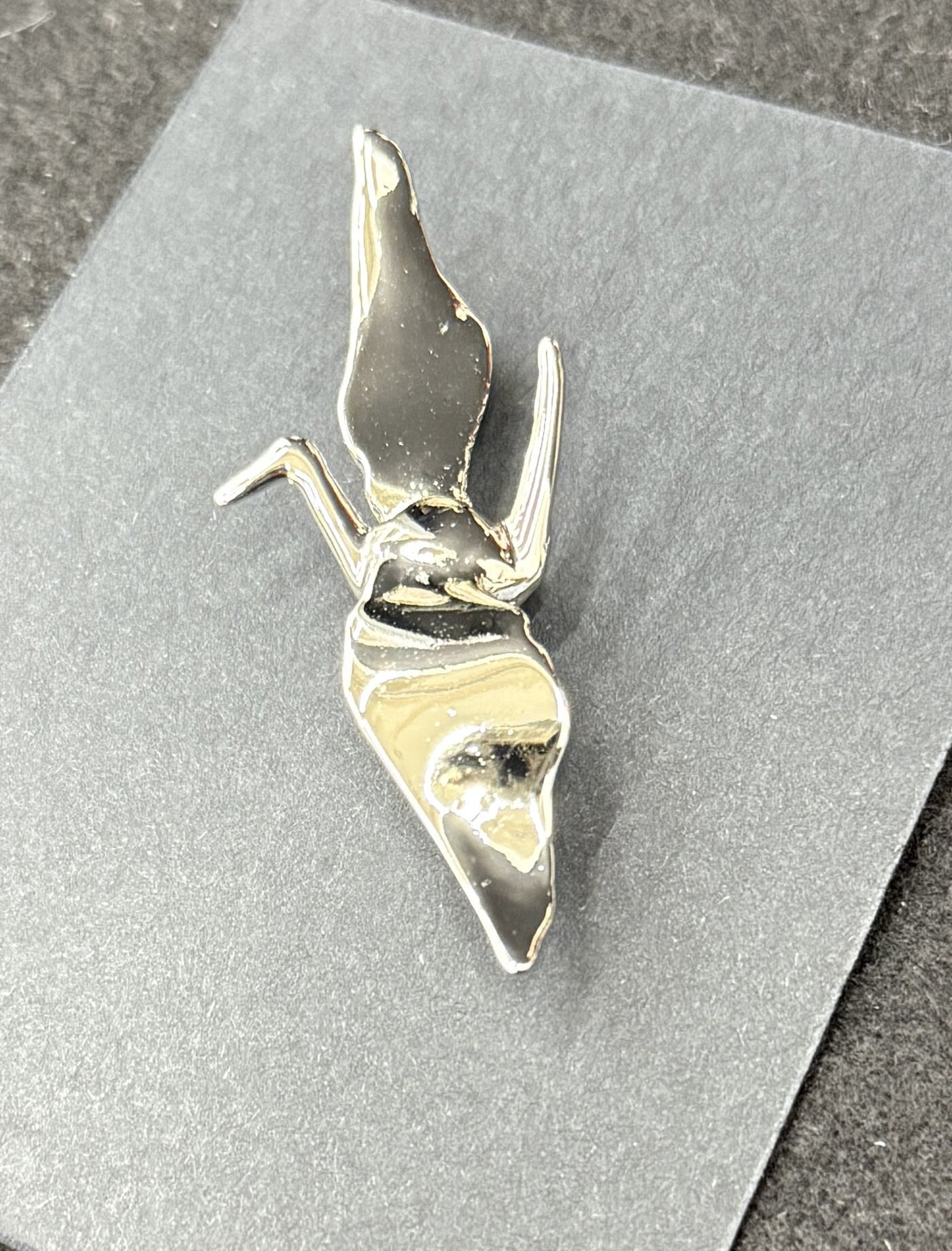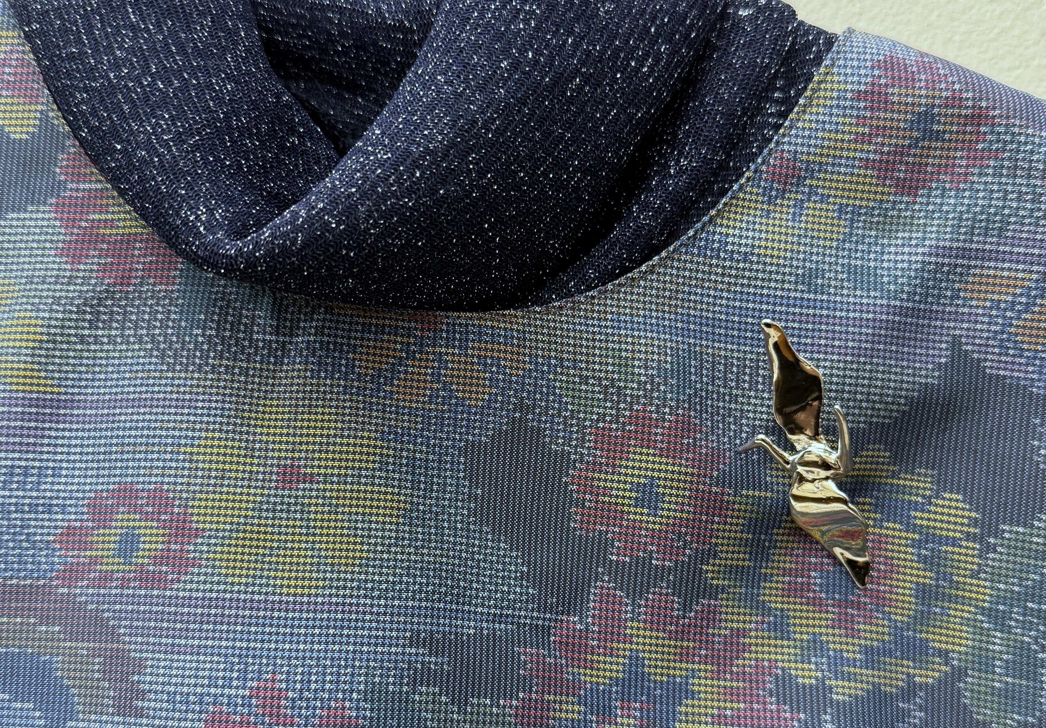 広島宮島の大聖院と、京都仁和寺に納められている「折り鶴の碑」をブローチにしました。日々の装いの中にさりげなく平和の祈りを。